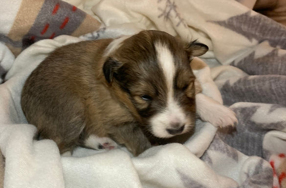 Der kleinste Racker von der Bande mit einer wunderschönen durchgehenden Blesse von der weißen Nase bis zu den Öhrchen. Sie hat einen großen weißen Tupfen im Nacken, weiße Pfötchen und Schwanzspitze, sowie eine weiße Brust. Den hellen Brand hat sie von ihrer Mama.