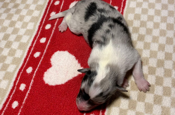 Das kleinere Mädchen hat eine durchgehende Blesse bis zum großen Kragen, welcher bis zu den Vorderpfötchen reicht. Auf der Stirn befindet sich ein kleiner brauner Tupfen und am Rücken hat sie einen langen schwarzen Streifen und viele Tupfen. Außerdem ist ihr grau das hellste des Wurfes.